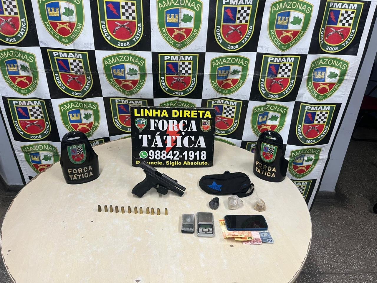 A arma apreendida é uma pistola Taurus modelo 840, calibre .40, de numeração SET 75892, tombamento 47951 da PMAM, acompanhada de um carregador e 12 munições intactas.