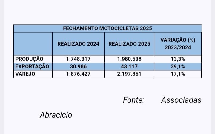 Em 2025, foram produzidas 1.980.538 motocicletas, volume 13,3% superior ao registrado em 2024. Segundo a Abraciclo, esse foi o melhor resultado desde 2011 e o terceiro maior da história do setor. Os emplacamentos atingiram 2.197.851 unidades, alta de 17,1%, enquanto as exportações somaram 43.117 motocicletas, crescimento expressivo de 39,1%.