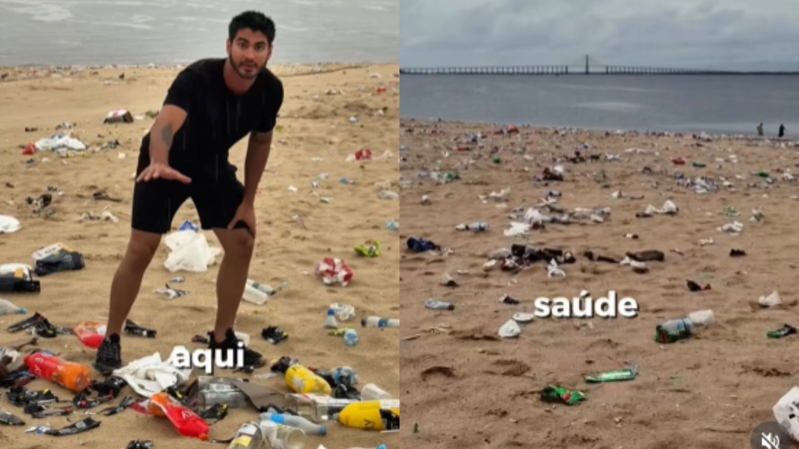 “Olha como amanheceu a praia da Ponta Negra, um dos principais cartões-postais de Manaus. Ontem teve show aqui, lotou, mas o problema não é lotar. O erro é isso aqui: copos, garrafas, sacolas, tudo indo parar no Rio Negro”, afirmou.