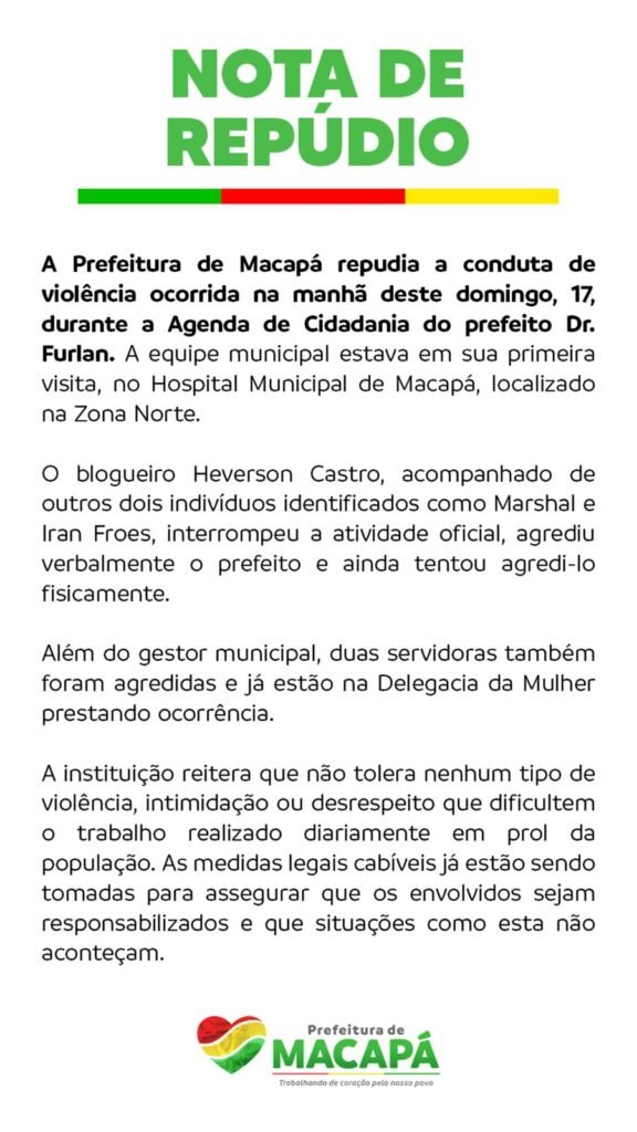 Em nota, a Prefeitura de Macapá afirmou repudiar os atos de violência ocorridos durante a Agenda de Cidadania do prefeito. “A instituição reitera que não tolera nenhum tipo de violência”, diz o comunicado.