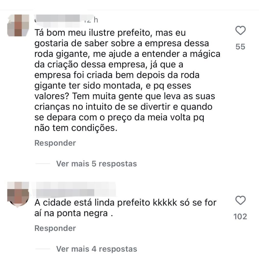 Em publicação nas redes sociais, o prefeito afirmou que há vídeos indicando que integrantes da equipe do autor da denúncia, o vereador suplente Amauri Gomes (União Brasil), teriam tentado “cortar o fio da roda-gigante”. Ele também disse que o equipamento parou depois que Amauri gravou um vídeo “meia hora antes” denunciando uma suposta ligação clandestina no local.