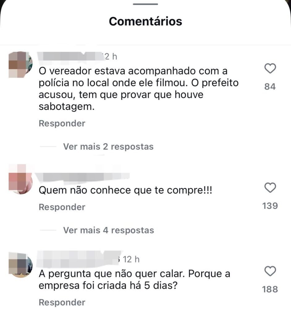 Nos comentários da própria publicação, internautas questionaram a narrativa do prefeito. “O vereador estava acompanhado com a polícia no local onde ele filmou. O prefeito acusou, tem que provar que houve sabotagem”, disse um usuário.