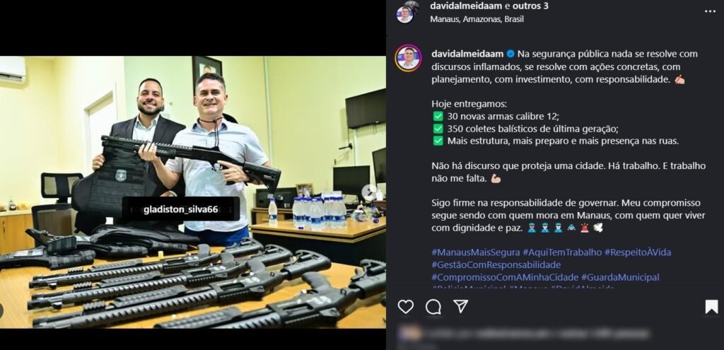 MANAUS (AM) – Após as mortes de Giovana Ribeiro e de sua bebê Maria Clara, em acidente por causa de um buraco na avenida Djalma Batista, no último domingo, 22/6, o prefeito de Manaus David Almeida (Avante) fez um post onde aparece sorrindo em meio a um arsenal de armas. A publicação repercutiu negativamente.