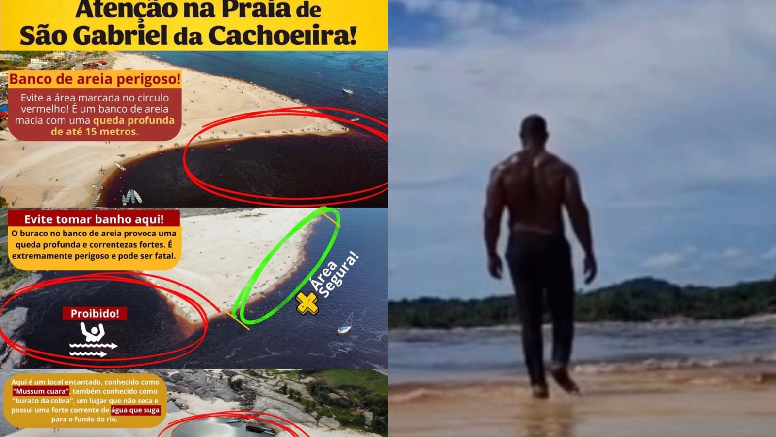 Diante do perigo, a Prefeitura do município, localizado a 853 quilômetros de Manaus, publicou um alerta nesta terça-feira, 16/12, classificando o banho no local como “extremamente perigoso” e com risco de morte. A orientação é que a população utilize apenas os pontos sinalizados como seguros, identificados pela cor verde, e evite áreas marcadas em vermelho.