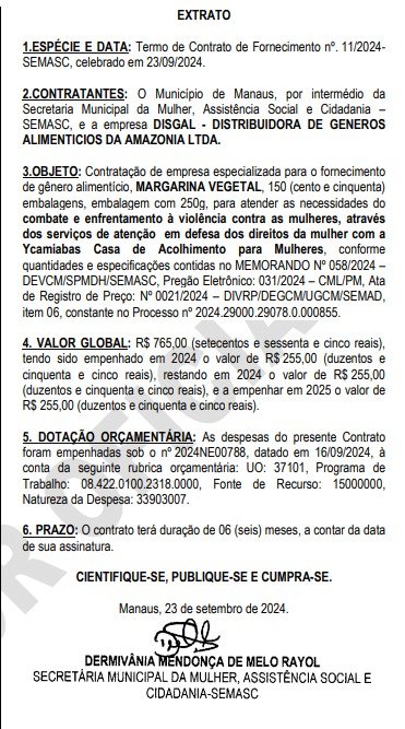 Em um contrato anterior, a Secretaria da Mulher, Assistência Social e Cidadania (Semasc) adquiriu 150 potes de margarina, totalizando R$ 765,00, com a justificativa de que os alimentos seriam utilizados em ações voltadas ao enfrentamento da violência contra as mulheres.