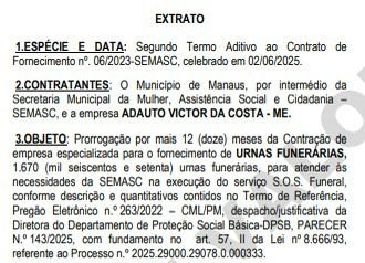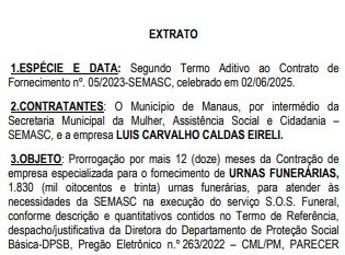 MANAUS (AM) – A Prefeitura de Manaus prorrogou, por mais 12 meses, contratos no valor total de R$ 2,9 milhões para aquisição de urnas funerárias (caixões), destinadas ao programa S.O.S. Funeral, da Secretaria Municipal da Mulher, Assistência Social e Cidadania (Semasc).