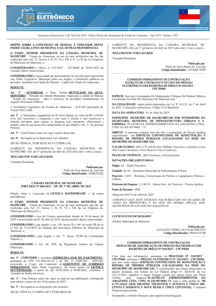 MANAUS (AM) – A Prefeitura de Manicoré homologou um contrato de R$ 6.375.169,05 com a empresa Plastiflex Empreendimentos da Amazônia LTDA, que é alvo de investigações do Ministério Público do Amazonas (MPAM) por contratos suspeitos com gestões anteriores.