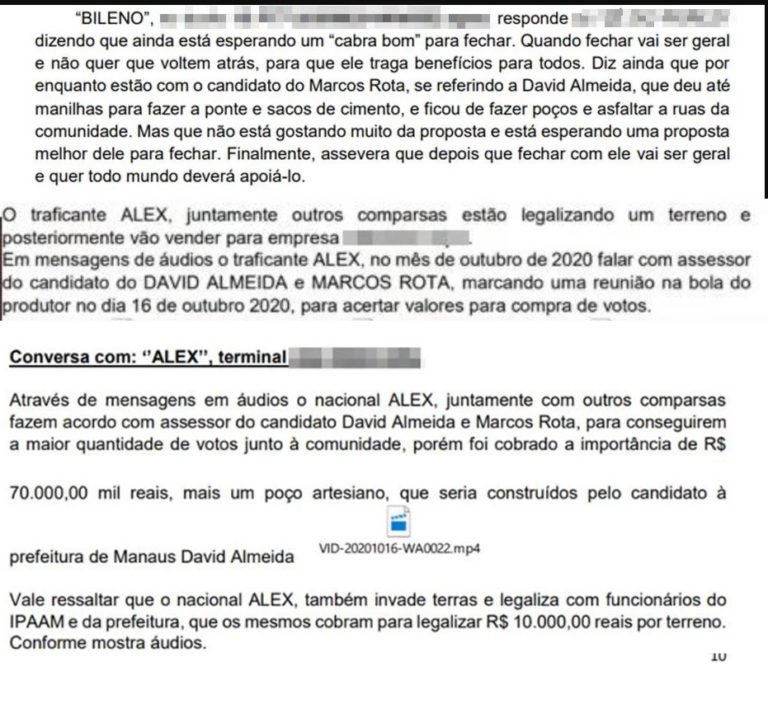 “Era de interesse do CV/AM (Comando Vermelho), à época, ter essa aproximação com políticos, pois praticavam a invasão de terras, vendiam lotes, traficavam drogas e cobravam uma espécie de condomínio de cada residência. Esse tipo de dinâmica foi interessante para a campanha de David Almeida, pois poderia levar serviços básicos a esses locais e aproveitar o voto de cabresto dessa população vulnerável”, informa um dos documentos publicados pela Revista Veja.