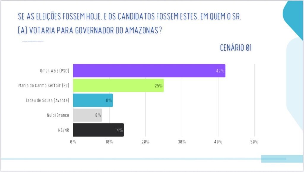 Segundo o estudo, Maria do Carmo soma 25% das intenções de voto, enquanto o senador Omar Aziz (PSD) aparece com 42%, uma queda de um ponto em relação à pesquisa anterior. O vice-governador Tadeu de Souza (Avante) registrou 11%, oscilando um ponto para mais.