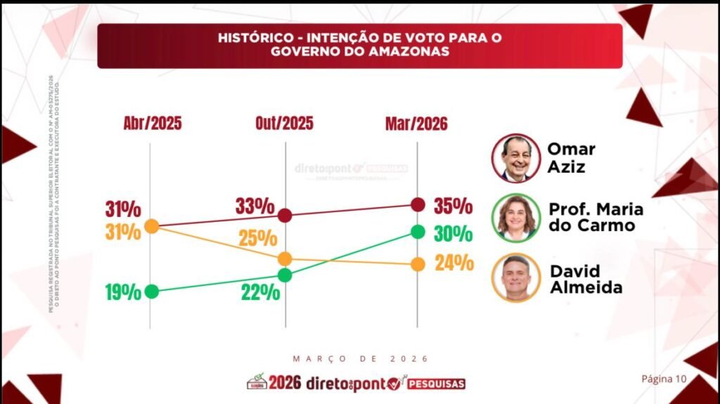 MANAUS (AM) – A pré-candidata ao Governo do Amazonas, Professora Maria do Carmo (PL), foi a que mais registrou crescimento nas pesquisas de intenção de voto desde abril de 2025 na disputa pelo comando do estado.