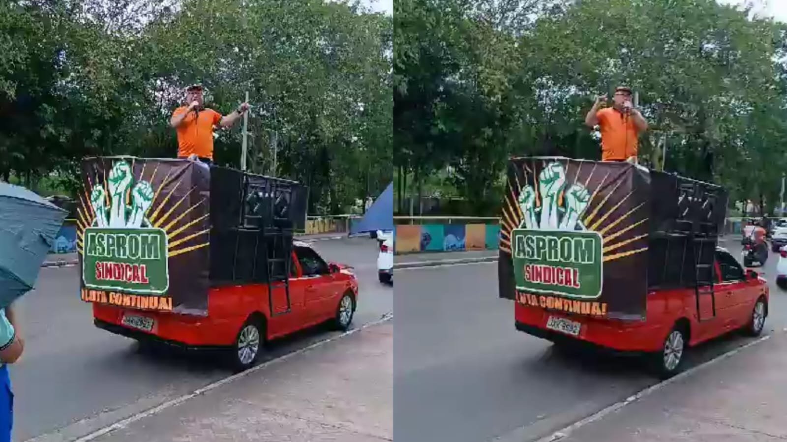 “Companheiros, nós fizemos a tentativa de entrar na sede do governo do estado para buscar diálogo com o governador interino, Roberto Cidade. Vocês que estão acompanhando pela transmissão ao vivo puderam presenciar a força policial dizendo claramente que não havia ordem do governador para receber o sindicato representativo dos professores e pedagogos da capital”, declarou.