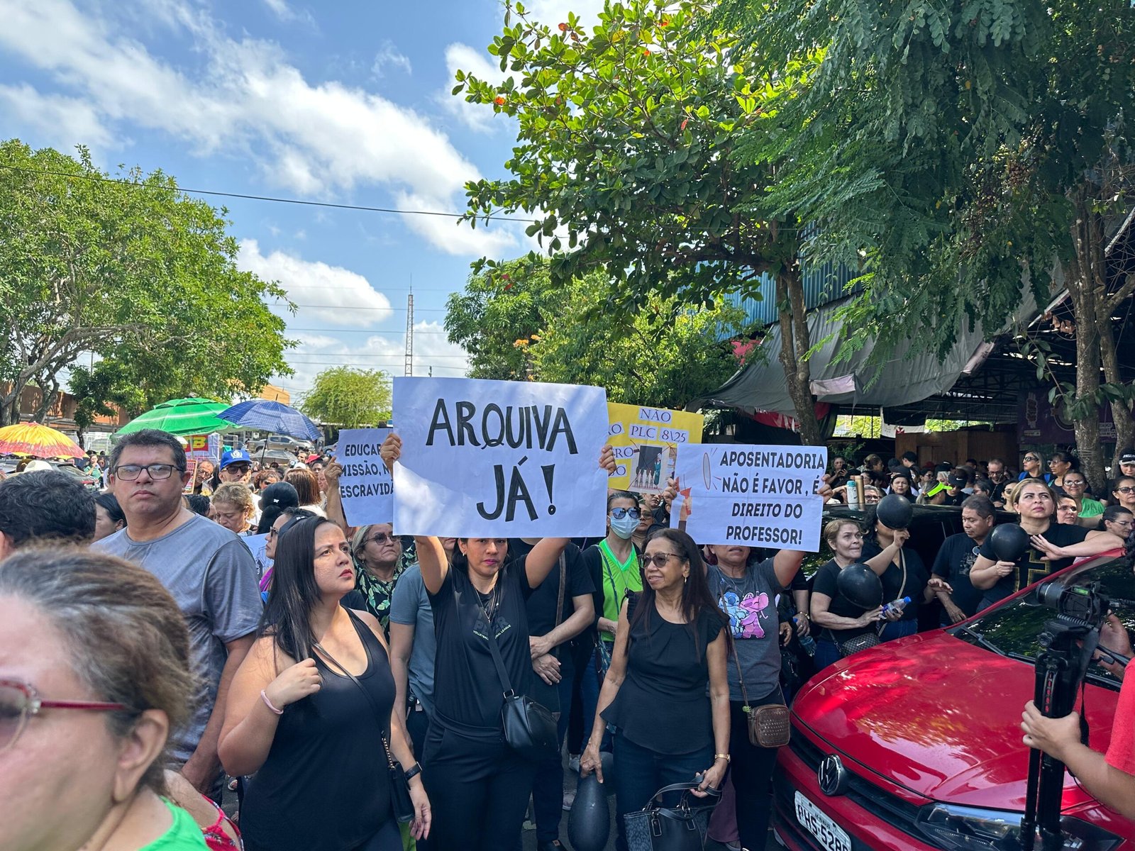 MANAUS (AM) – Profissionais da educação protestam, na manhã desta quarta-feira, 24/9, em frente à Câmara Municipal de Manaus, no bairro Santo Antônio, zona Oeste da cidade, contra o Projeto de Lei Complementar nº 8/2025, que trata da Reforma da Previdência dos servidores municipais.