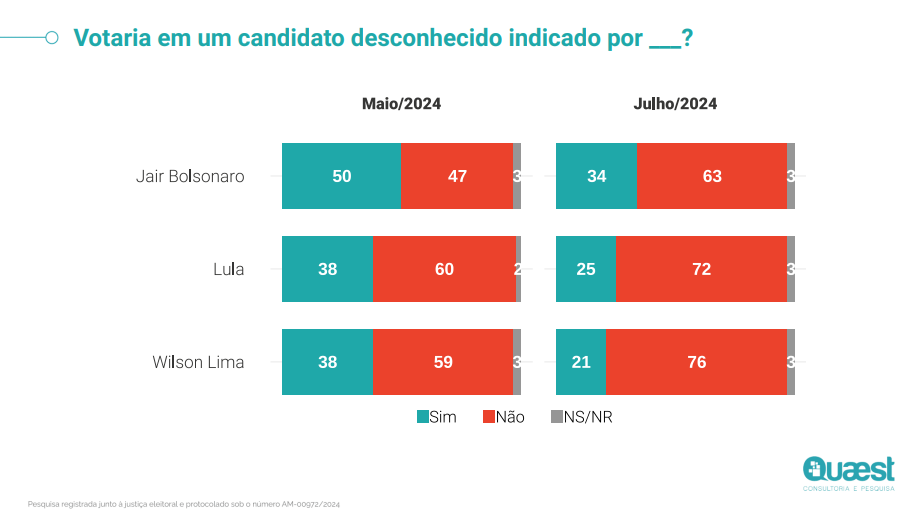 A Quaest perguntou aos eleitores se votariam ou não em um desconhecido que fosse apoiado pelo atual presidente ou pelo ex-mandatário, na capital amazonense. O levantamento também apontou a influência do governador do Amazonas, Wilson Lima (União Brasil), no pleito deste ano.
