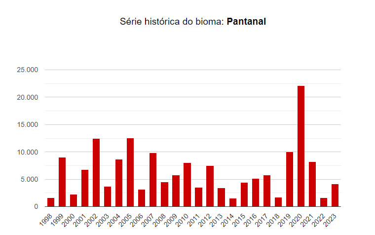 Ao longo de cinco meses, 2020 testemunhou recordes consecutivos de queimadas no Pantanal, atingindo seu pico em setembro, com 8.106 focos de incêndio. Esses números representam uma parte significativa do bioma que ainda não se recuperou e se soma com as áreas afetadas atualmente.