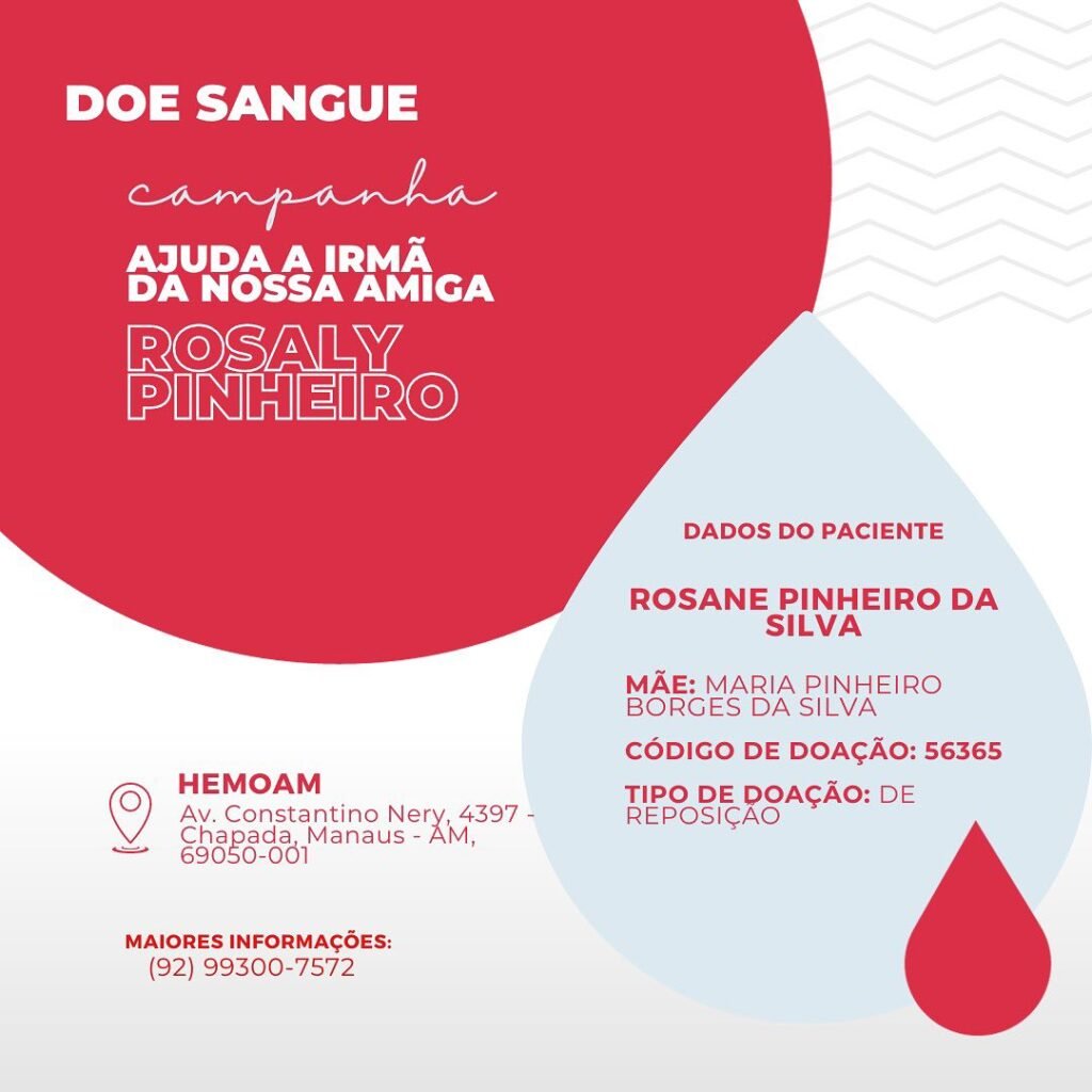 MANAUS (AM) – A rede RIOS DE COMUNICAÇÃO lançou nesta terça-feira, 3/10, uma campanha de doação de sangue para ajudar a familiar de uma das colaboradoras, a jornalista e apresentadora do Jornal da Rios, Rosaly Pinheiro, transmitido todas as manhãs pela rádio RIOS FM 95,7. O código para doação de reposição é 56365