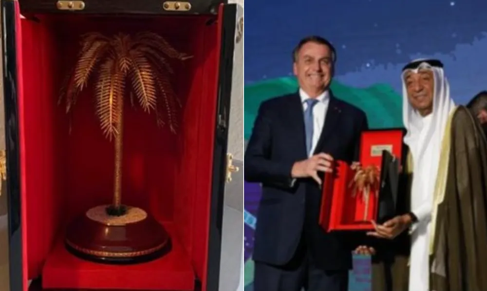 Na imagem, o então presidente Jair Bolsonaro aparece recebendo a escultura num evento realizado em 16 de novembro de 2021, durante o Encerramento do Seminário Empresarial da Câmara de Comércio Árabe-Brasileira na cidade de Manama, no Reino do Bahrein.