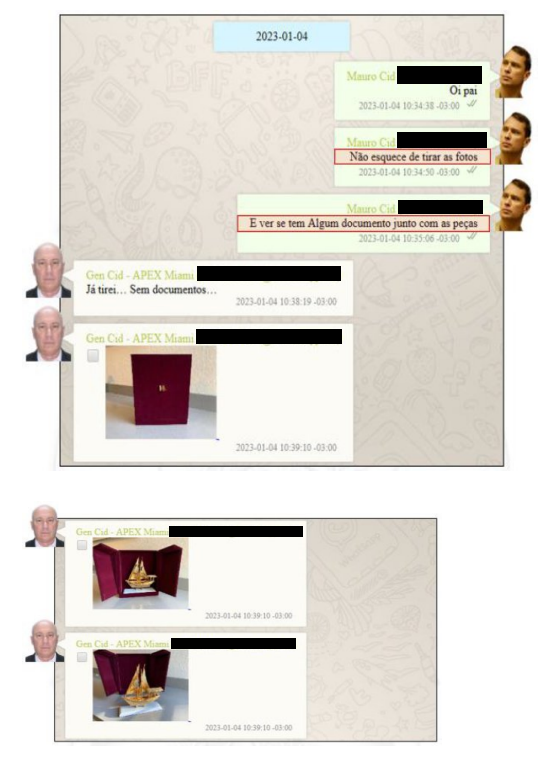 De acordo com investigações da Polícia Federal, foram ainda reveladas conversas entre pai e filho, onde Mauro Cid filho pediu para que o pai tirasse foto das joias. Em seguida, ele manda as fotos de dois objetos: uma palmeira e um barco dourados. Uma das imagens virou prova contra o pai do ex-assessor e ex-ajudante de ordens de Jair Bolsonaro.
