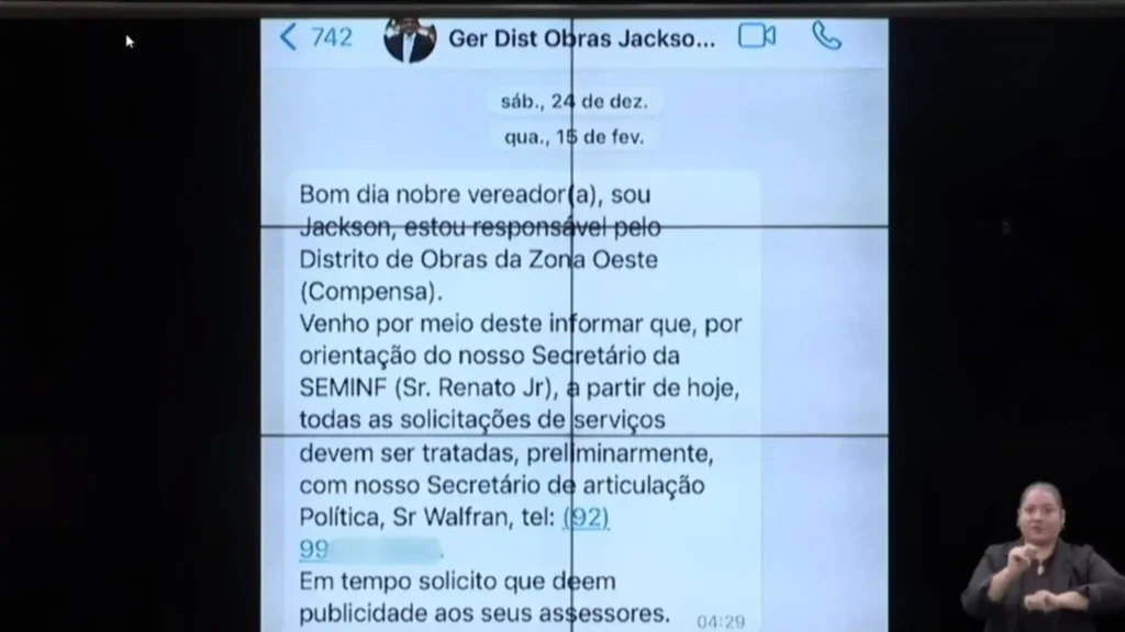 O vereador ainda expôs o print de uma mensagem, no telão da Câmara Municipal de Manaus (CMM), em que o gerente do Distrito de Obras da Compensa, identificado apenas como Jackson, informa que as demandas de Marcelo deveriam ser encaminhadas primeiramente, ao secretário de articulação política, Walfran Torres.