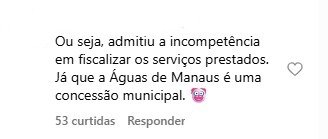 “Admitiu a incompetência em fiscalizar os serviços prestados. Afinal, a Águas de Manaus é uma concessão municipal”, comentou um usuário.