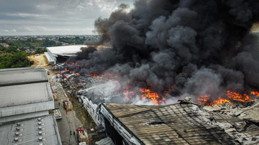 Um incêndio de grandes proporções atingiu as fábricas da Effa Motors e da Valfilm da Amazônia, no Distrito Industrial II, zona Leste de Manaus.