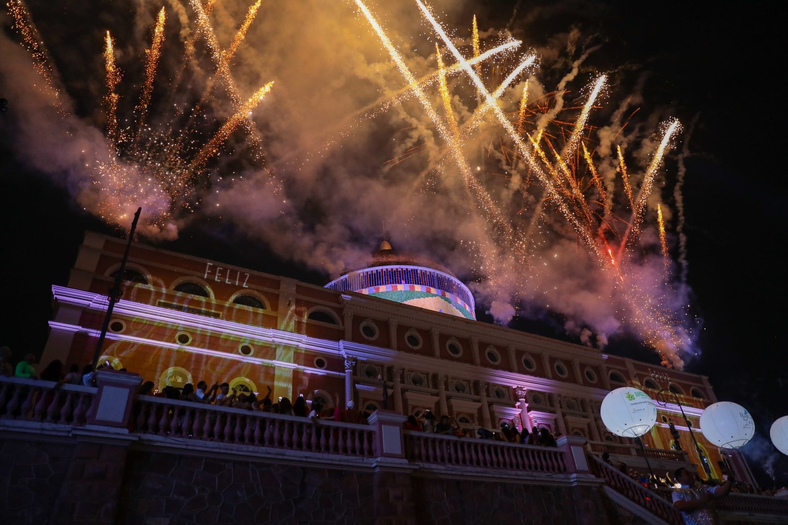 À meia-noite, a queima de fogos, de aproximadamente dez minutos, encantou o público, com uma trilha sonora especial que colocou todos para dançar enquanto o show pirotécnico acendia o céu do Centro Histórico de Manaus.