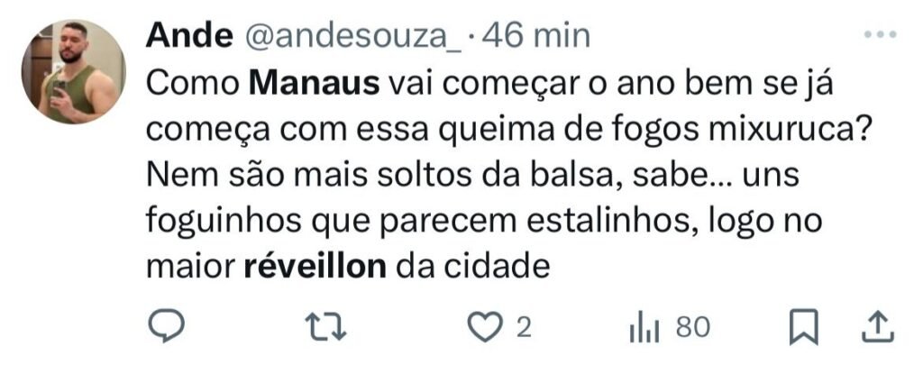 “Como Manaus vai começar o ano bem se já começa com essa queima de fogos mixuruca? Nem são mais soltos da balsa, sabe… uns foguinhos que parecem estalinhos, logo no maior réveillon da cidade”, publicou.
