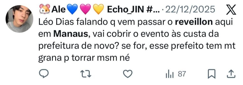Em outra postagem, o tom foi ainda mais direto: “O prefeito pagou o Leo Dias pra vir cobrir o réveillon aqui em Manaus???”.