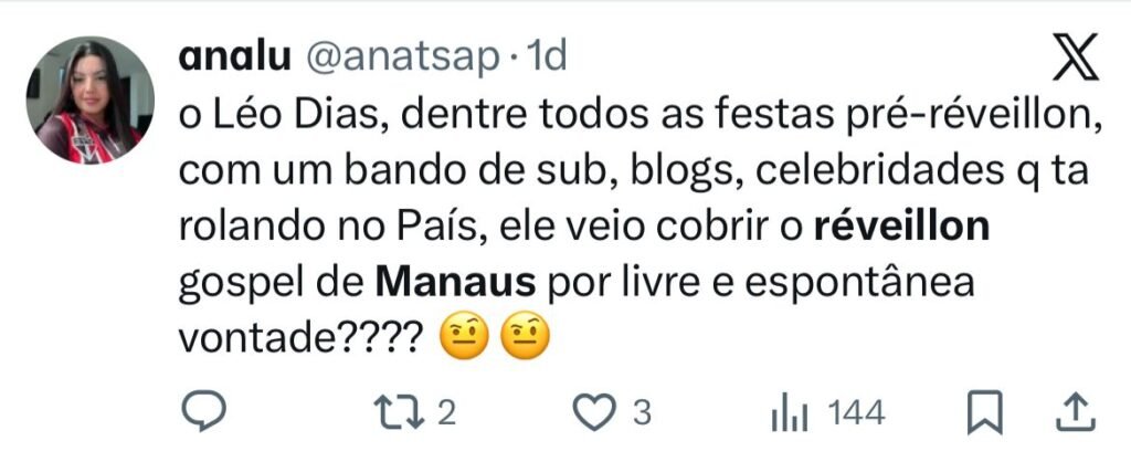 “O Léo Dias, dentre todas as festas pré-réveillon, com um bando de sub, blogs, celebridades que tá rolando no País, ele veio cobrir o réveillon gospel de Manaus por livre e espontânea vontade????”, escreveu uma internauta.