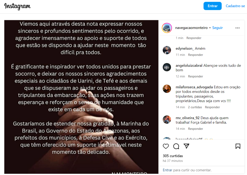 O agradecimento foi aos moradores do município de Uarini (a 564 quilômetros de Manaus), de Tefé (a 529 quilômetros da capital amazonense), e aos demais órgãos oficiais que se dispuseram em ajudar os passageiros e tripulantes da embarcação durante o incêndio no rio Solimões.