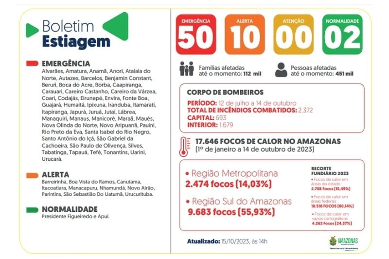 Os impactos dessa baixa das águas são significativos. No estado do Amazonas, 50 dos 62 municípios foram declarados em situação de emergência devido à estiagem. Isso afeta diretamente 451 mil pessoas, total de 112 mil famílias, conforme o boletim de estiagem divulgado no domingo, 15/10.