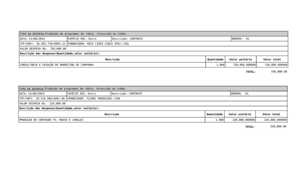 O valor foi pago à empresa Mais Cinco Cinco SPE2 LTDA, de CNPJ: 56.991.738/0001-12), especializada em consultoria e criação de marketing de campanha.