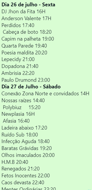 Além dos shows de rock, haverá apresentações de hip hop e Reggae. O Dj Jhon da Fita, não vai deixar ninguém parado nos intervalos das apresentações das bandas. A entrada é gratuita e a festa começa a partir das 17h, na sexta, e às 14h no sábado.