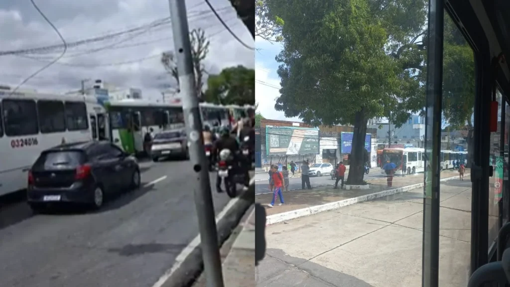 Vídeos publicados nas redes sociais mostram motoristas interrompendo a circulação dos ônibus e orientando os passageiros a desembarcar, o que causou uma longa fila de veículos na via.