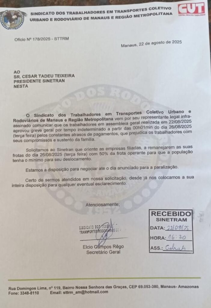 No ofício enviado ao Sindicato das Empresas de Transporte de Passageiros do Estado do Amazonas (Sinetram), o STTRM orienta que seja feito o remanejamento da frota para garantir que, ao menos, 50% dos ônibus estejam em circulação durante a paralisação. A medida busca minimizar os impactos à população.