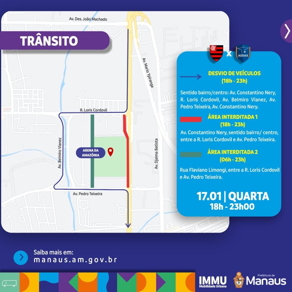 MANAUS (AM) – Devido ao jogo do Flamengo, a Prefeitura de Manaus irá realizar desvios no trânsito e transportes nas vias que dão acesso à Arena da Amazônia, nesta quarta-feira, 17/1, na zona Oeste da cidade. A medida é para permitir que os torcedores acessem o estádio com segurança.