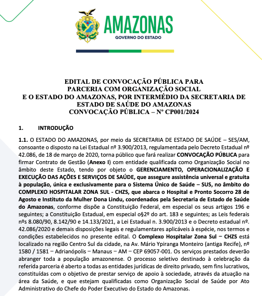 A entidade escolhida foi a Associação de Gestão, Inovação e Resultados em Saúde (Agir), convocada em novembro deste ano após receber um processo de licitação e firmar contrato com o Governo do Amazonas.