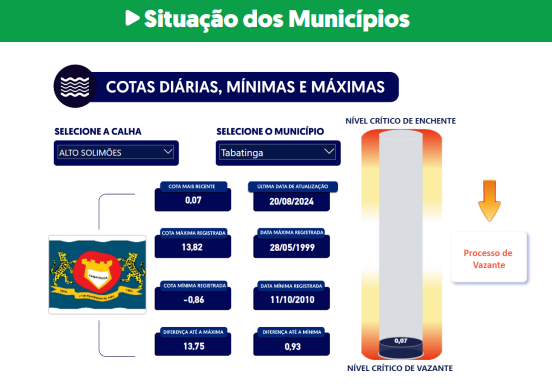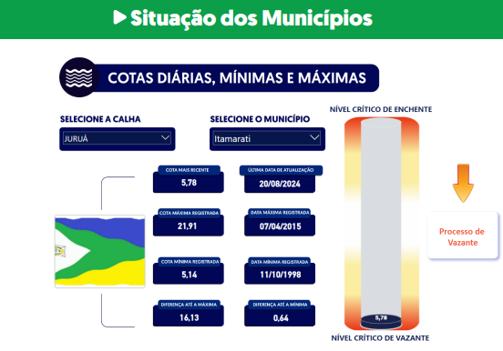Os municípios em situação de alerta incluem Amaturá, Atalaia do Norte, Benjamin Constant, Beruri, Boca do Acre, Canutama, Carauari, Eirunepé, Envira, Guajará, Ipixuna, Itamarati, Juruá, Lábrea, Pauini, Santo Antônio do Içá, São Paulo de Olivença, Tabatinga, Tapauá e Tonantins.