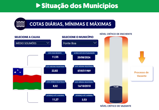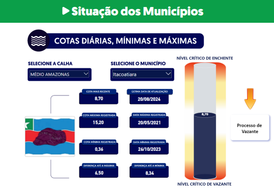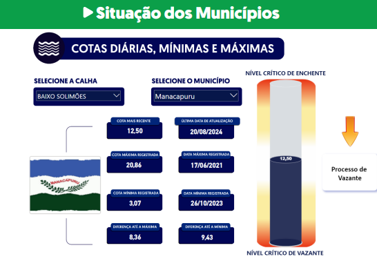 No Baixo Solimões, no município de Manacapuru, a 98,8 quilômetros de Manaus, a cota mais recente registrada foi de 12,50 metros. Enquanto na calha do Médio Amazonas, no município de Itacoatiara, a 270 quilômetros de Manaus, a cota mais recente registrada foi de 8,70 metros.