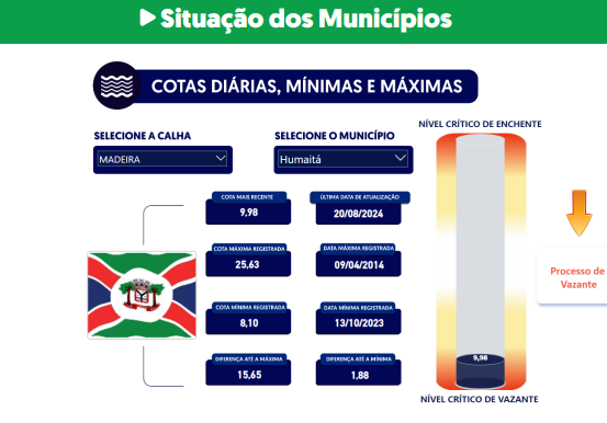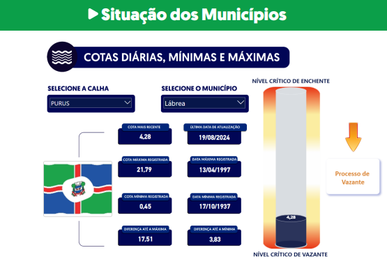 No Rio Purus, no município de Lábrea, a 852 quilômetros de Manaus, a cota mais recente registrada foi de 4,28 metros. No Rio Madeira, no município de Humaitá, a 696 quilômetros de Manaus, a cota mais recente registrada foi de 9,98 metros.