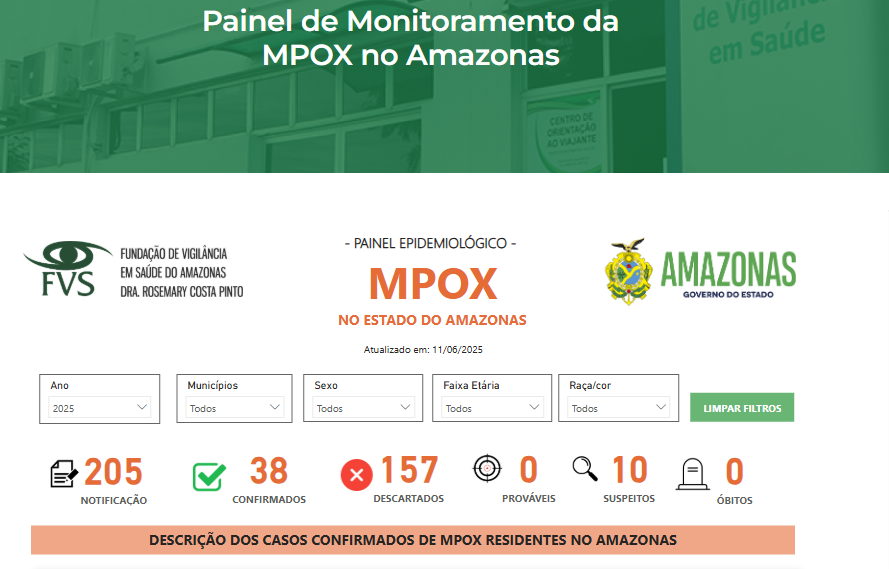 O número de casos confirmados de mpox no Amazonas subiu para 38, conforme o painel epidemiológico atualizado pela FVS-RCP nesta quarta-feira, 11/6. Desde o início do ano, o estado já notificou 205 casos da doença — sendo 157 descartados e todos os 38 casos confirmados localizados em Manaus.