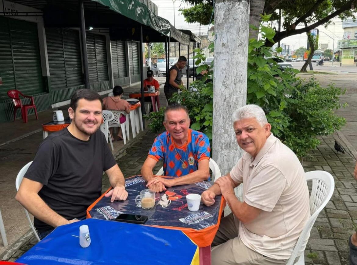 Na imagem, Renato aparece tomando café no local, acompanhado também do vereador Alonso Oliveira. Na legenda, Sabá escreveu: “No mercado da Cachoeirinha com o Vice-Prefeito Renato e Alonso. Tmj, David!”.