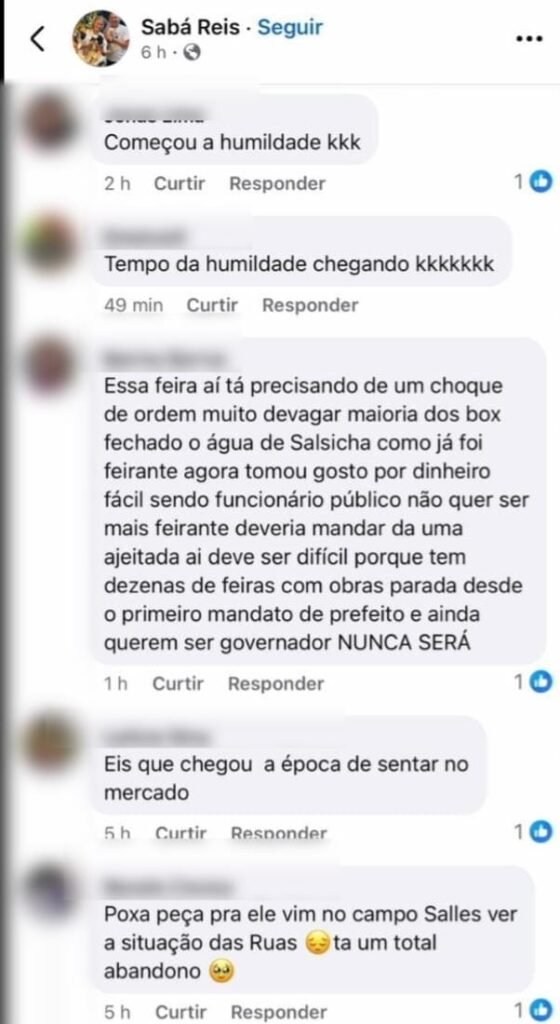 “Deveria mandar dar uma ajeitada aí. Tem dezenas de feiras com obras paradas desde o primeiro mandato do prefeito”, comentou um internauta. Outro resumiu: “Só picareta”.