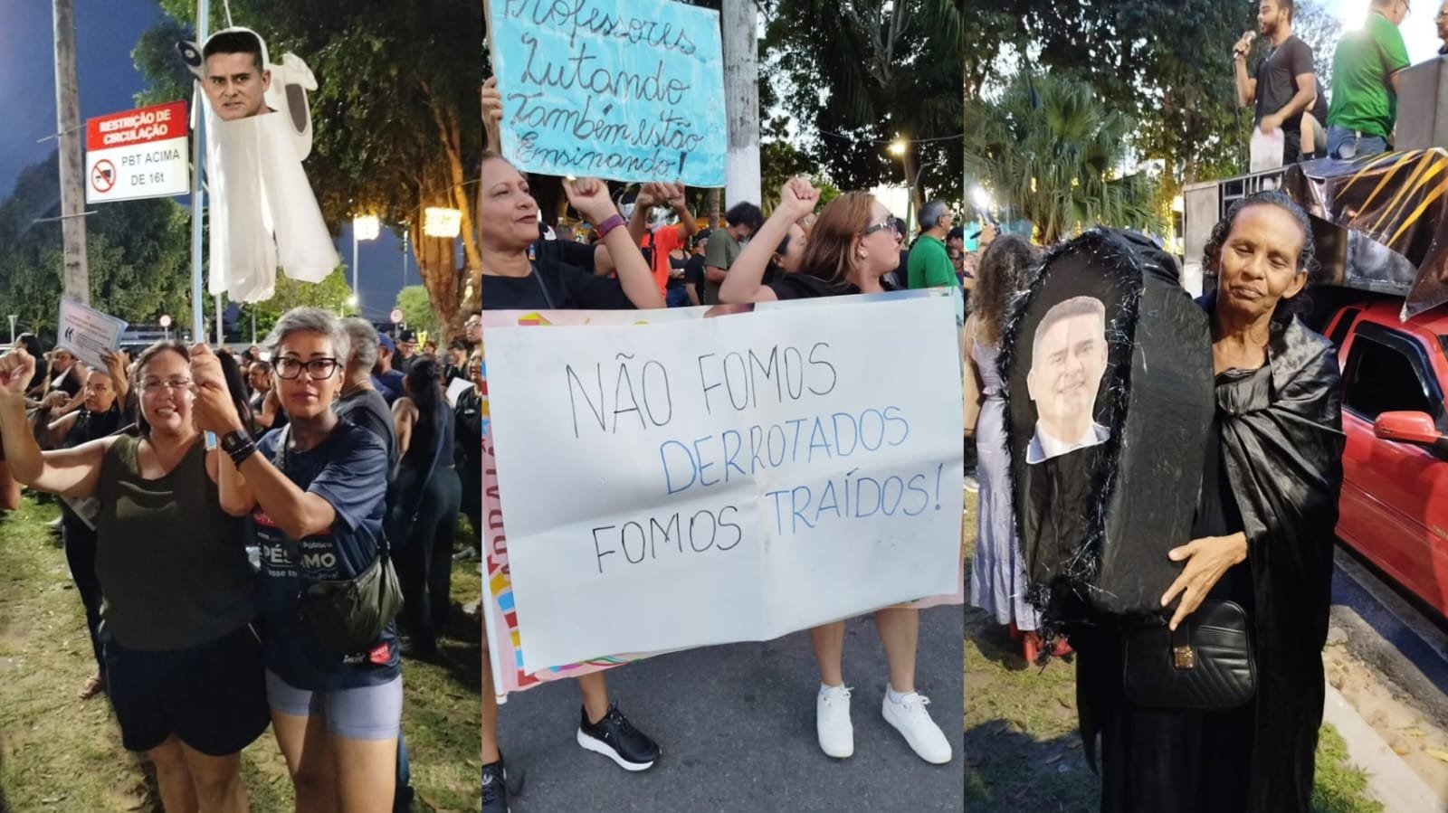Durante o protesto, servidores puxaram coro de “Fora, David”, em referência ao prefeito de Manaus, David Almeida (Avante), além de realizarem panelaço e exibirem cartazes. “David, seu opressor, tu não vai ser governador”, gritavam.