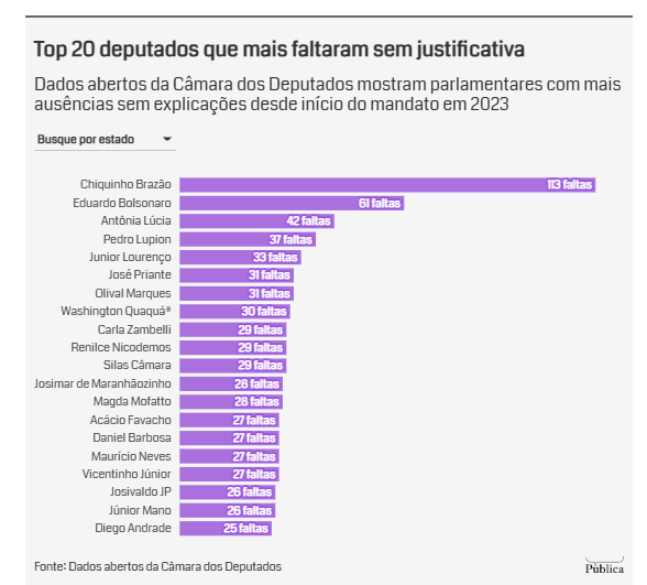 O levantamento também apresenta um panorama nacional. Desde 2023, os 513 deputados federais somaram 13.813 faltas em sessões deliberativas da Câmara.