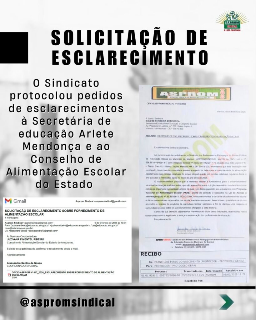 Em um dos documentos divulgados, o sindicato cita uma escola estadual localizada no bairro Japiim, que enfrenta precariedade na oferta de alimentação escolar desde o ano passado. Segundo a entidade, a situação se agravou no início de 2026, atingindo tanto escolas de tempo integral quanto unidades da rede regular.