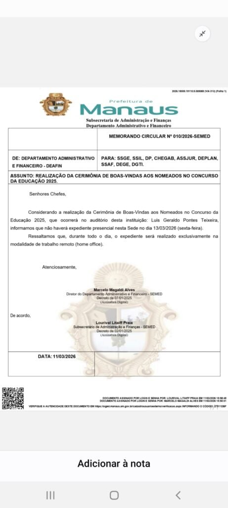 Segundo a entidade, os servidores da sede da secretaria estariam atuando em regime de home office durante o dia para a realização de uma cerimônia de recepção aos classificados do concurso público da educação de 2025. O evento contou com a presença do prefeito de Manaus, David Almeida, e foi realizado na sede da secretaria, localizada na avenida Maceió, zona Centro-Sul da capital, reunindo cerca de mil convidados.