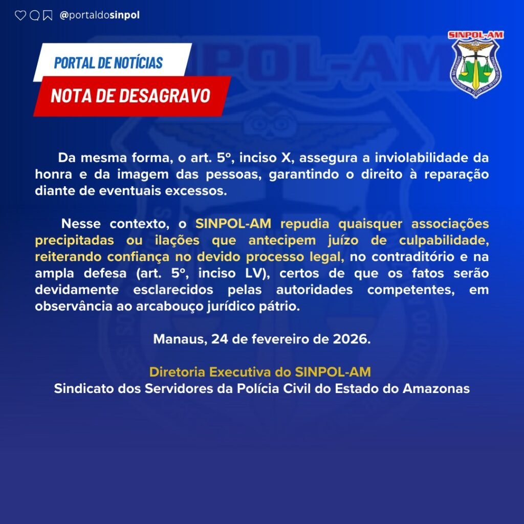 O SINPOL-AM ressalta que a nota tem caráter institucional e reforça que Anabela possui histórico profissional marcado por dedicação ao serviço público, ética e compromisso com a legalidade.
