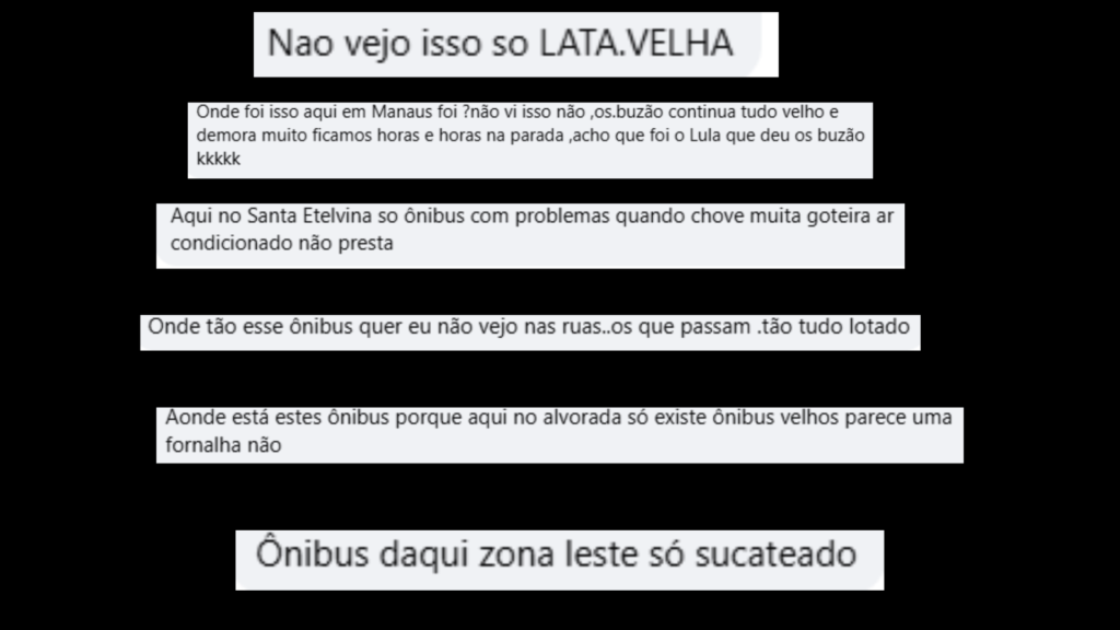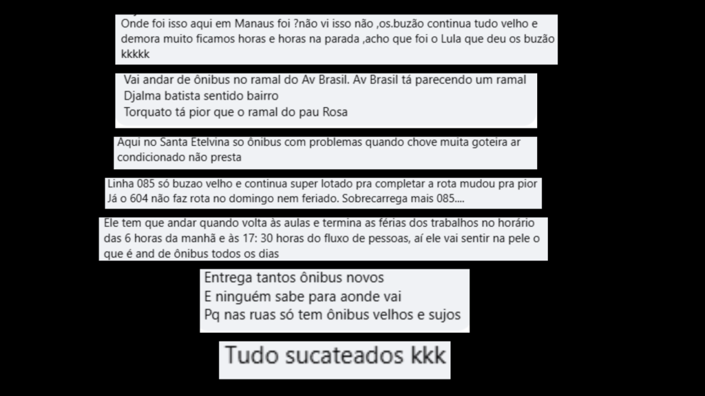 Outros relatos apontam que, apesar da entrega de veículos novos, nas ruas predominam ônibus velhos e sujos. Problemas estruturais, como goteiras durante o período de chuvas e ar-condicionado ineficiente, também foram destacados por usuários do sistema, principalmente em bairros como Santa Etelvina.
