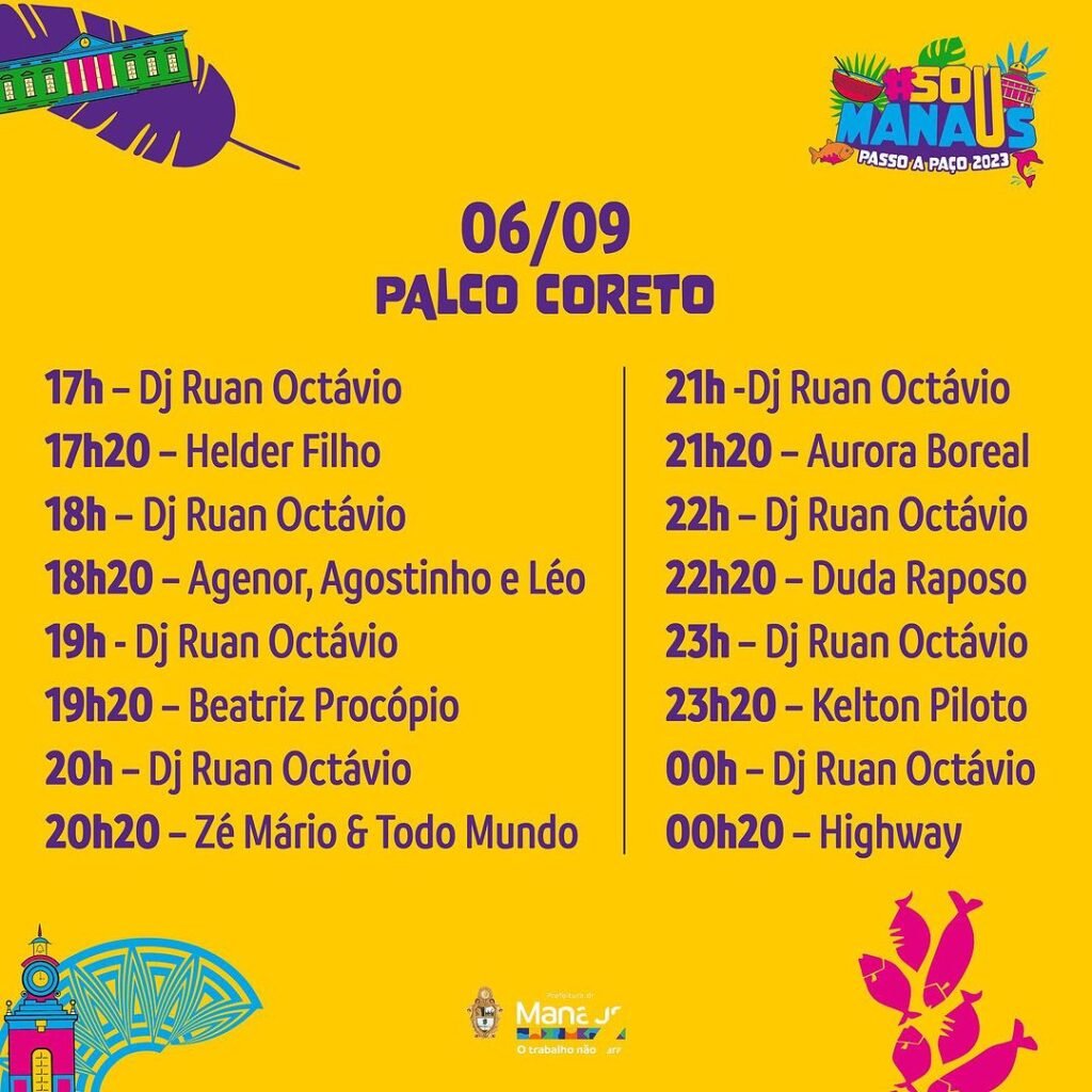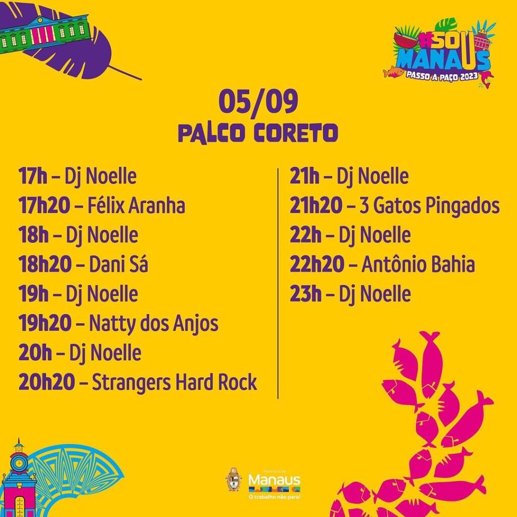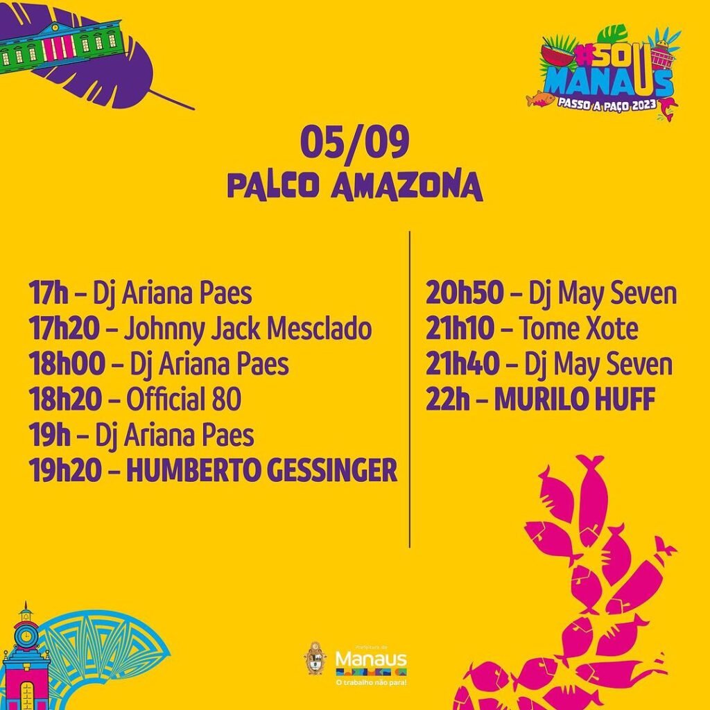 MANAUS (AM) – O evento que promete ser uma experiência de cores, sabores, talentos e sustentabilidade é mais que aguardado na capital do Amazonas. Neste sábado, 2/9, a Fundação Municipal de Cultura, Turismo e Eventos (Manauscult) divulgou a programação do festival cultural “Sou Manaus Passo a Paço 2023”.