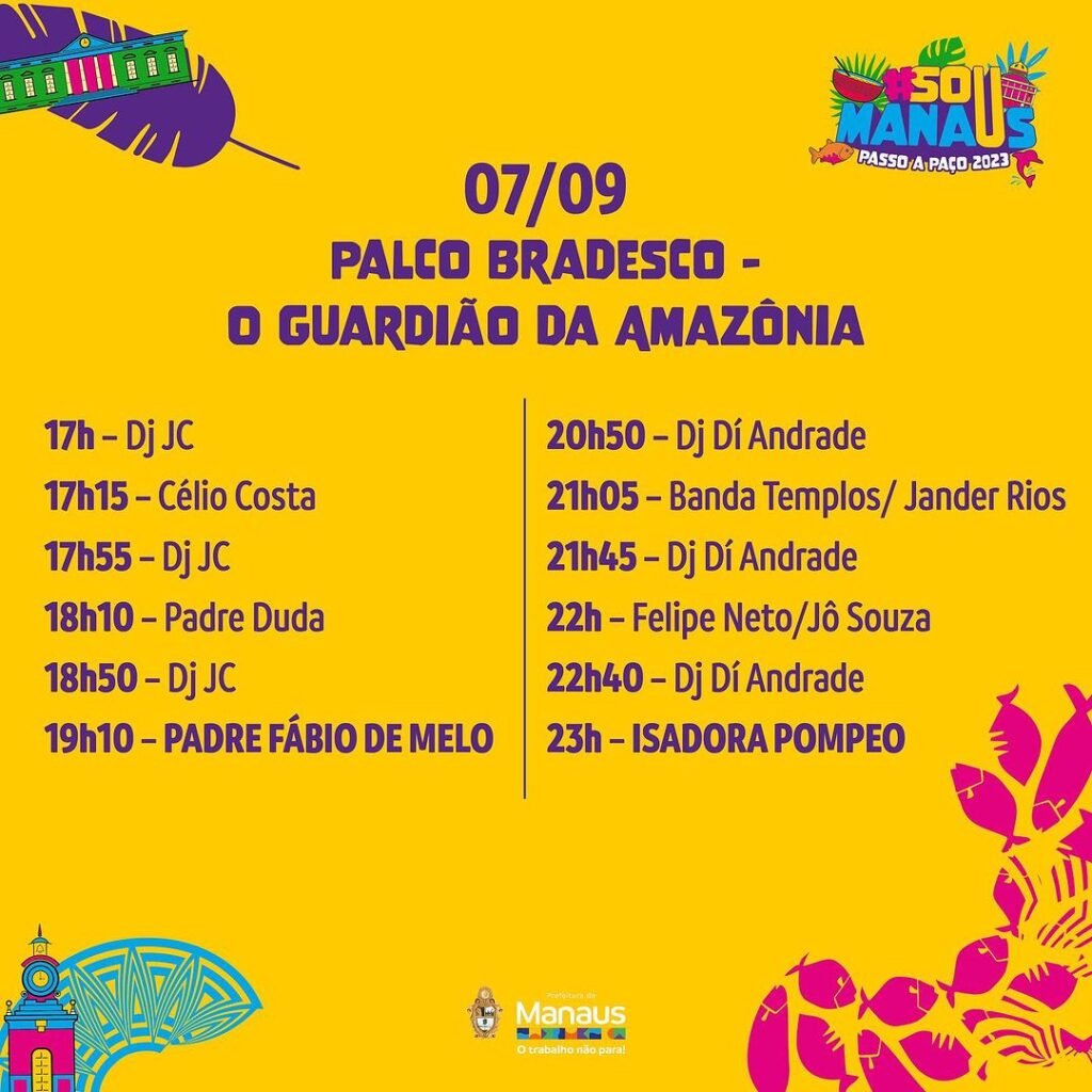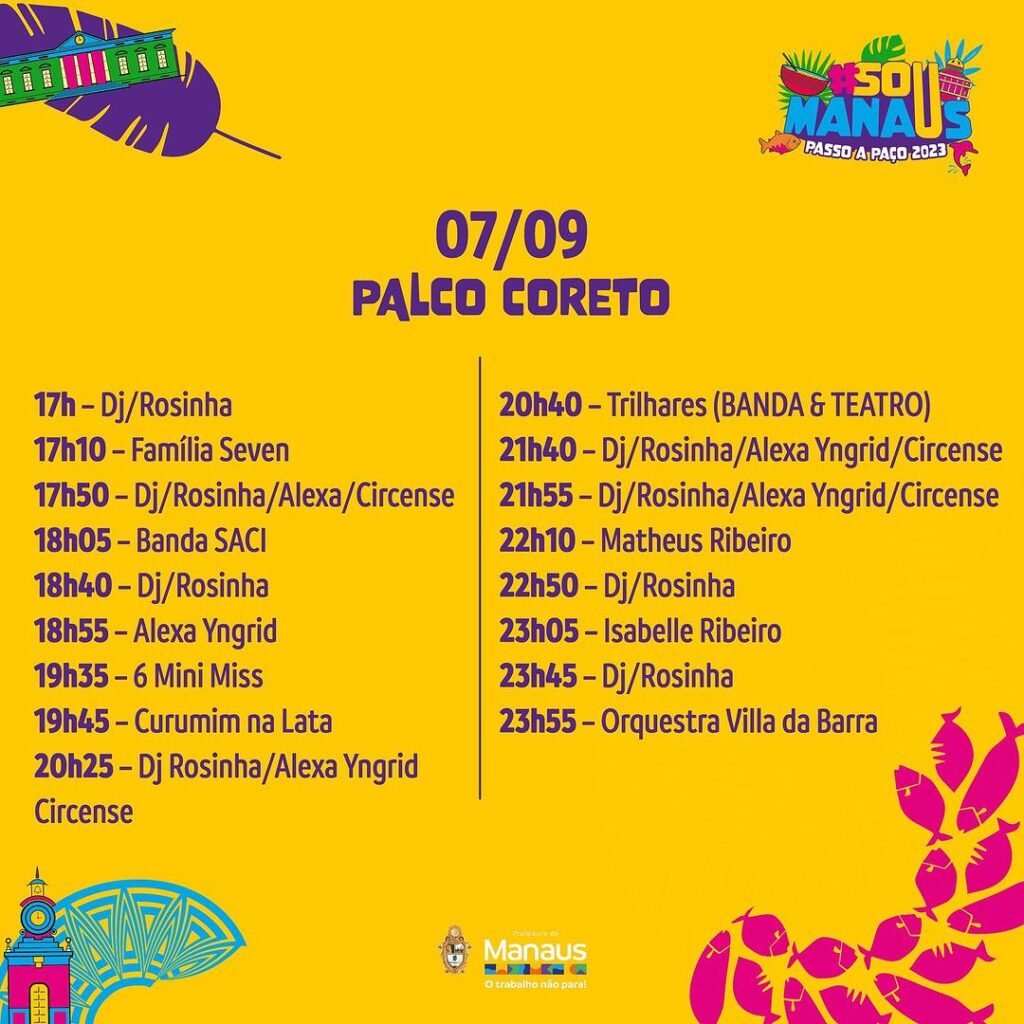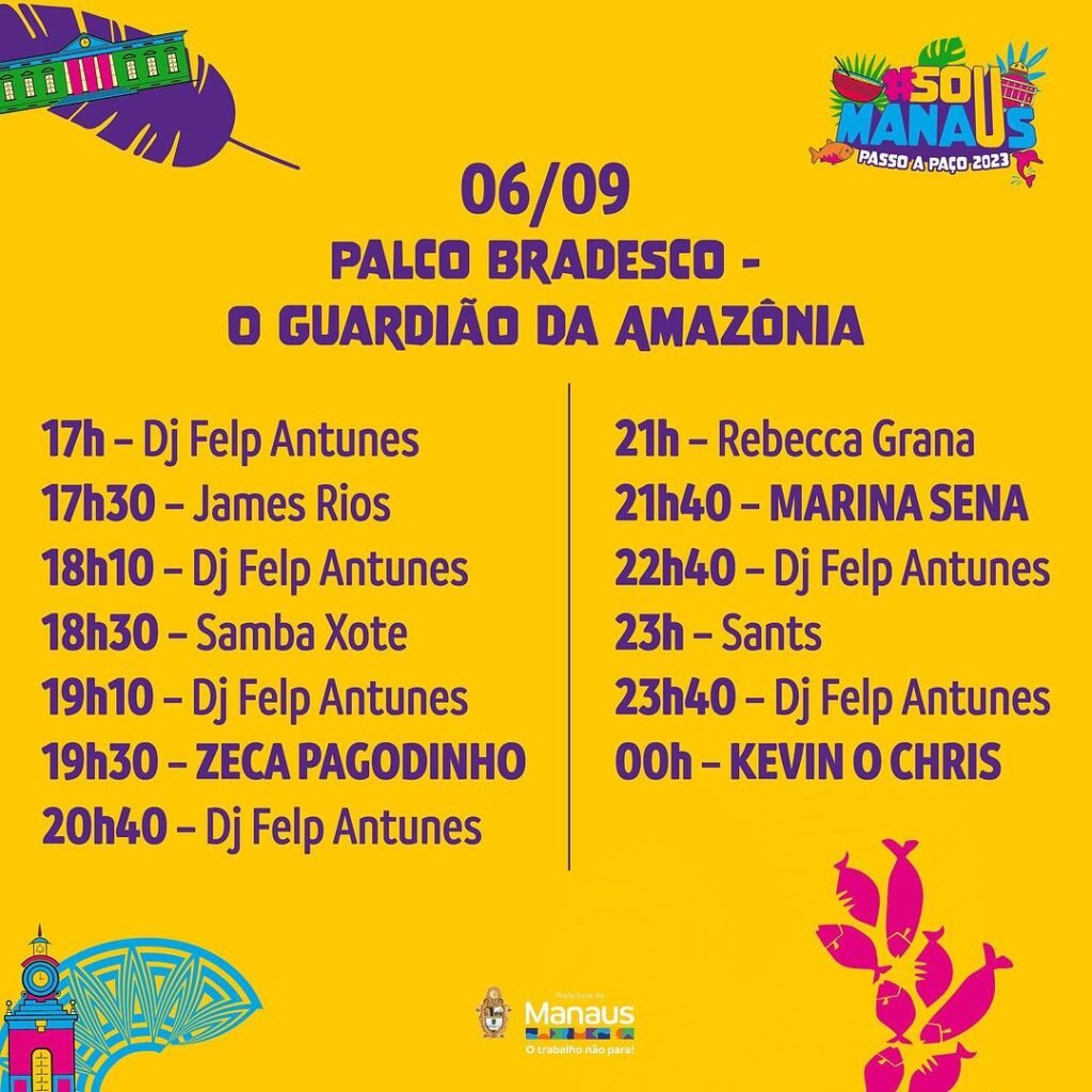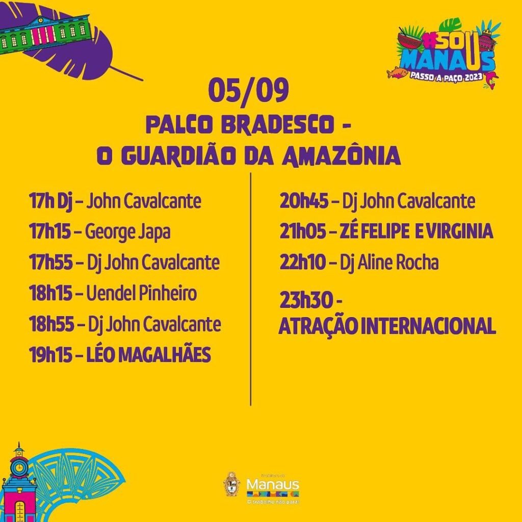 MANAUS (AM) – O evento que promete ser uma experiência de cores, sabores, talentos e sustentabilidade é mais que aguardado na capital do Amazonas. Neste sábado, 2/9, a Fundação Municipal de Cultura, Turismo e Eventos (Manauscult) divulgou a programação do festival cultural “Sou Manaus Passo a Paço 2023”.